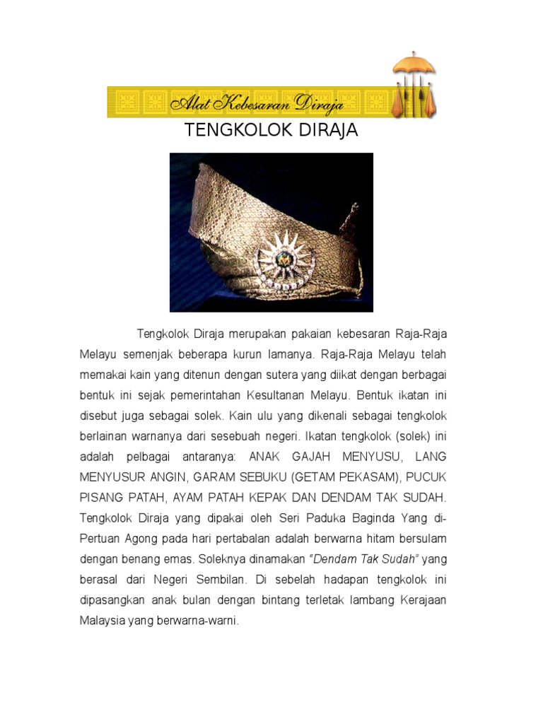Apakah Senjata Kebesaran Diraja : Pakaian diraja kesimpulan cokmar muskat kita perlulah memupuk semangat partiotisme di kalangan rakyat.. Learn vocabulary, terms and more with flashcards, games and other study tools. Pegangannya, atau hulunya, terbuat dari emas, cula badak, atau gading. Selain itu, kita haruslah berbangga menjadi seorang rakyat malaysia dan menyayangi negara kita. Apakah yang perlu dilakukan apabila jumpa pengemis di jalanan apakah senjata kebesaran diraja anda rosakkan calculator kawan, apakah tindakan anda Pending diraja dan keris pendek diraja juga adalah juga sebahagian daripada pakaian istiadat pertabalan.