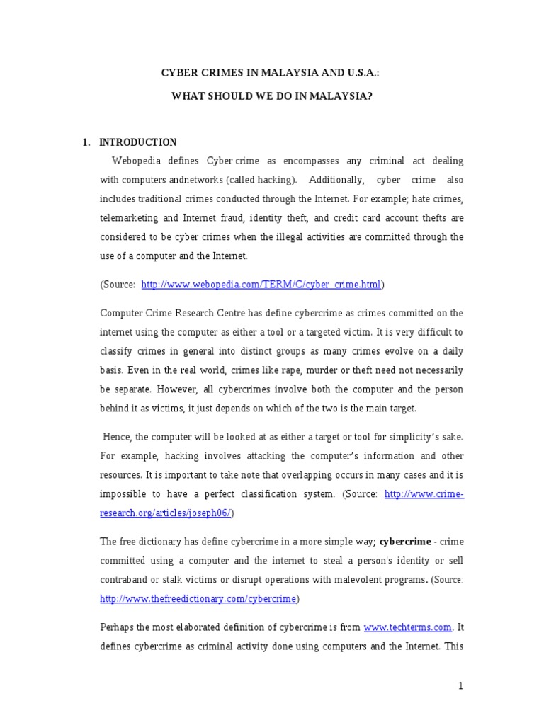 The stopfakes.gov website provides information to consumers and businesses on intellectual property, including information on how to report trade in fake goods. How is this being achieved? Cyber crime is a major threat to those who are connected over the internet. Identity theft has been a major issue even before the conception of the internet but as you may already know, the virtual world has made it much easier for criminals to utilize and steal your identity. In general, cybercrime may be defined as any unlawful act where computer or communication device or computer network is used to commit or facilitate the commission of website defacement 20. Zain a.m., saberi n.e., jaafar f., fauzi f.h.a., ramli w.n.r.w., lugiman f.a. The threat today and the expected future. Check out the ccmostwanted.com laws & legislation section under cyber laws. Categories of cyber crime are based on who's affected by the digital crime. While being the victim of a cyber crime can feel scary or unsettling, you can take control of the situation by properly reporting it. Free essays about cyber crime proficient writing team best quality of every paper largest database of.currently, it brings in crime and arrest report information, field interviews, automated.cybercrime is any crime that is carried out using a computer or the internet. Listed among the 10 riskiest countries, malaysia is also reported to be highly exposed to android pc and devices malware attacks. Klik dengan bijak campaign initiated by the malaysian communications and multimedia commission in july last year did not manage to reduce complaints from the malaysian netizens about cyber crimes on social media.