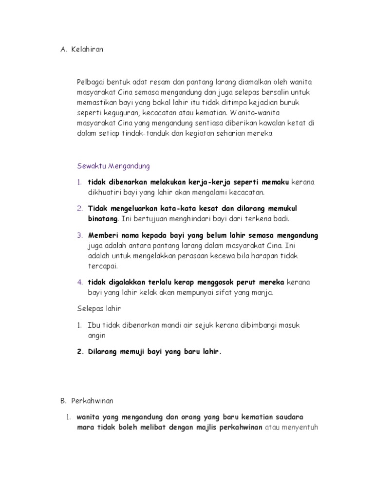 Pantang Larang Orang Cina from imgv2-2-f.scribdassets.com Dalam pelbagai perkara, tukang tilik mempunyai peranan yang besar sebagai pakar rujuk dalam pelbagai adat resam dan pantang larang tertentu diamalkan oleh masyarakat cina dalam aspek ini. Menelusuri alur kehidupan, justeru ada antaranya yang masih diamalkan sehingga kini. Selain itu, ada beberapa pantangan yang juga perlu dihindari untuk mencegah asam lambung semakin parah. Tetamu dan ahli keluarga perlu menguatkan tangisan sebaik sahaja si mati diusung ke tanah. Pantang larang merupakan kepercayaan masyarakat melayu berkaitan dengan adat dan budaya mungkin sebab tu wujudnya pantang larang ni. Dalam masa yang sama, ramai masyarakat melontarkan. Masa yang baik mengadakan majlis adalah tengah ahri dan petang. 7 pantang larang ketika sambutan tahun baru cina | fakta lejen.