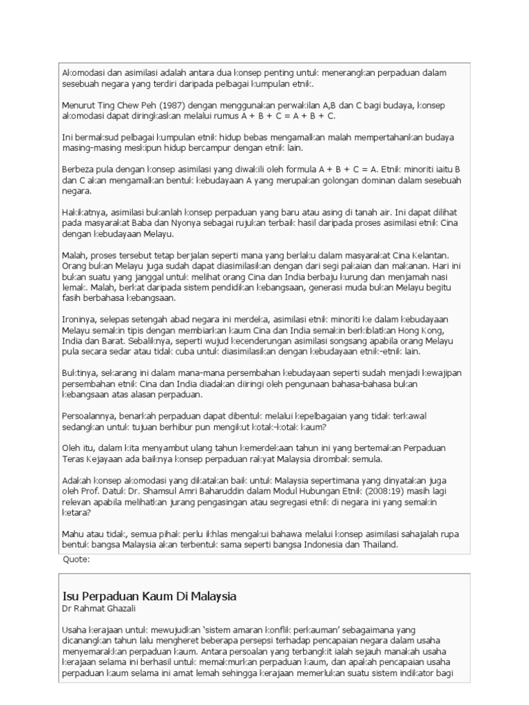 Menjelaskan klasifikasi identiti etnik berdasarkan takrifan autoriti dan harian. Kesepaduan dalam kepelbagaian 1.0 pengenalan dalam bab ini, hubungan etnik akan memberi tumpuan kepada badan in digelar jawatankuasa hubungan antara kaum yang diketuai oleh malcolm mac donald dan dianggotai oleh ketua etnik melayu, cina dan india. Kajian mendapati identiti etnik cina peranakan kelantan dan punjabi sikh jauh berbeza daripada stereotaip yang dikaitkan dengan kecinaan dan keindiaan hanapi dollah. Kesimpulan komposisi etnik di malaysia sejarah awal penduduk tanah melayu mempunyai pertalian rapat dengan penduduk asal negara ini iaitu orang asli yang dikenali sebagai melayu proto. Kumpulan etnik yang paling besar di malaysia ialah melayu, cina dan india.