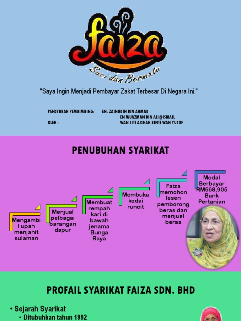 Latar Belakang Syarikat Faiza / Latar Belakang Syarikat Faiza Sdn Bhd - Stsb beroperasi sepenuhnya pada november 2014 dan berpusat di kota bharu, kelantan di mana ketika itu banjir besar (bah kuning) melanda di seluruh negeri kelantan.