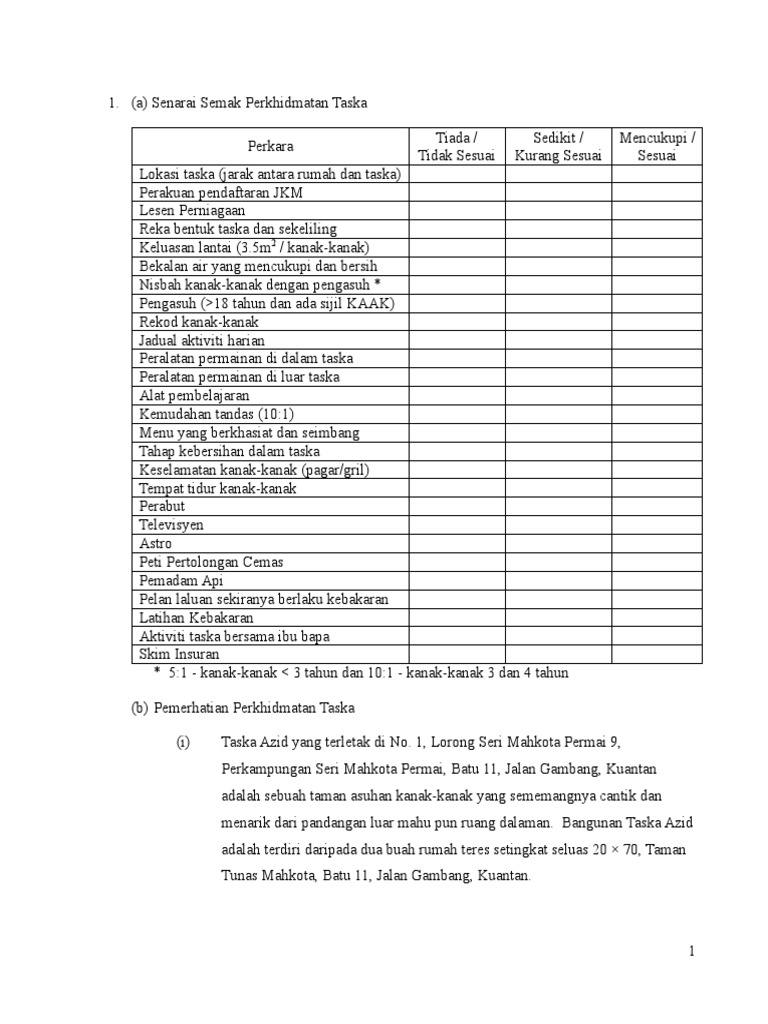 Senarai semak keselamatan di taska. Senarai semak keselamatan di taska. Senarai semak keselamatan di taska nama taska : Apr 02, 2012 · senarai semak pemeriksaan krselamatan tempat kerja dan healthy setting 1. Taska yang baik dan berkualiti ialah taska yang menitikberatkan selain dari aspek asuhan dan didikan juga sangat menekankan tentang aspek keselamatan di premisnya.